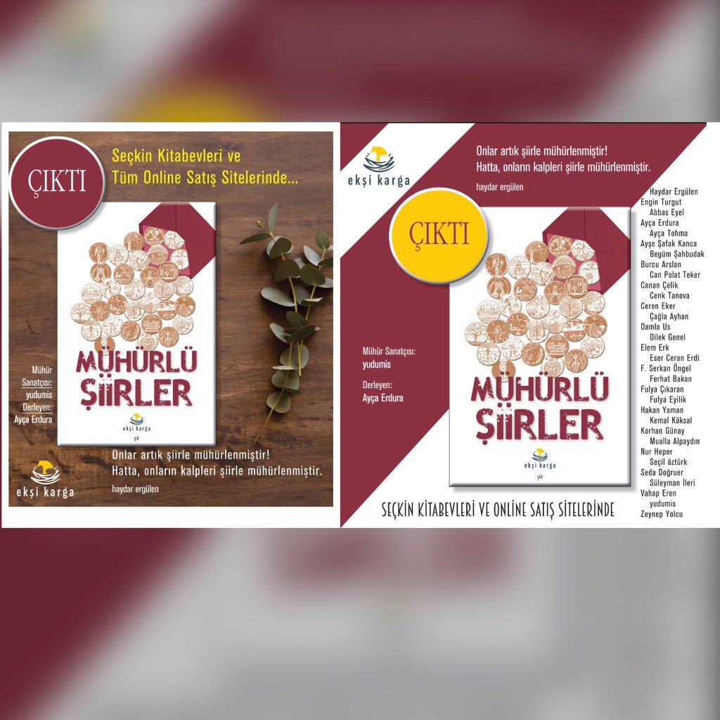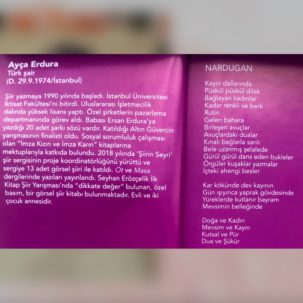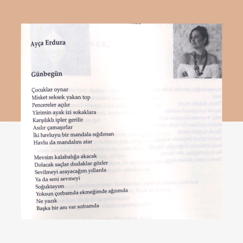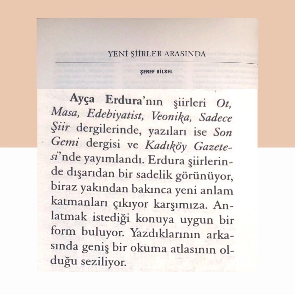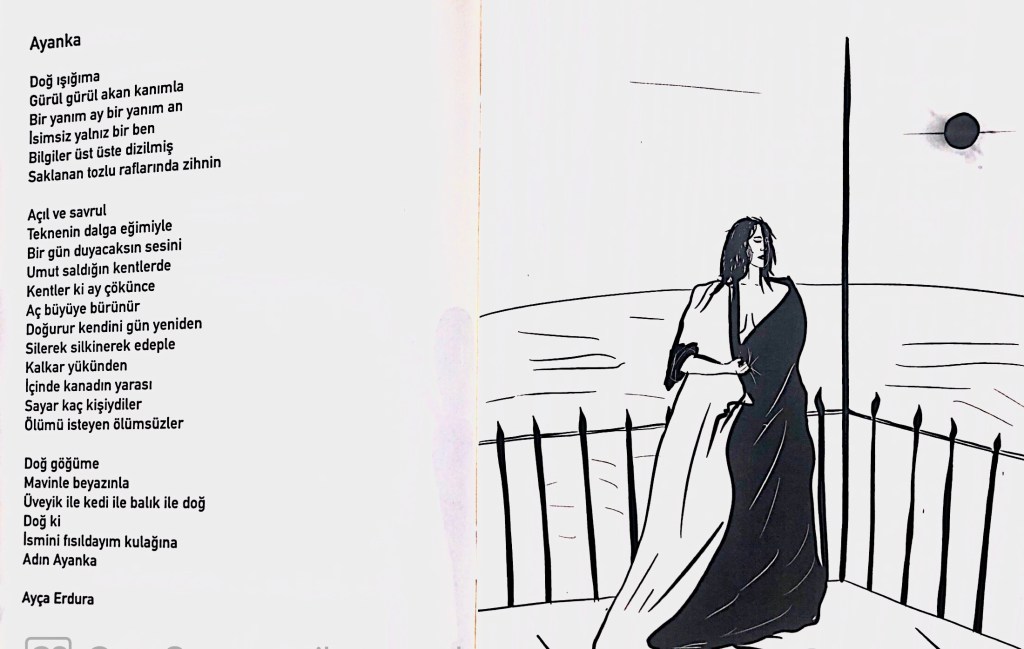Hikayelerim / Yazılar / Haberler / Derlediğim Kitaplar / Antolojiler 23 Ekim 201922 Mayıs 2021 Ayça Erdura Önce Aşkın Müziği Gelir Edebiyatist Dergi Kasım-Aralık sayısında yayınlanan hikayem (2019) Varlık Dergisi Mart 2021 Yazılar Edebiyatist Dergisi Kasım Aralık 2020 Şair Engin Turgut’un Zarf Zihin kitabımla ilgili yazısı Masa Dergisi Eylül 2020 Seyhan Livaneli Öykü Yarışması söyleşi Ocak 2019 Haydar Ergülen Hocam ile Şiirin Seyri bilgilendirme yazısı Haberler Kadıköy Gazetesi Kasım 2018 Şiirin Seyri söyleşisi Birgün Gazetesi Eylül 2020 Pazar Eki Haydar Ergülen Hocam ile Longplay şiirim Hürriyet Gazetesi Kitap Sanat Eki Zarf Zihin kitabımın değerlendirme yazısı Haydar Ergülen Cumhuriyet Gazetesi Ocak 2020 Seyhan Livaneli Öykü Yarışması 2020 Ödül Töreni Aydınlık Gazetesi Ocak 2020 Kadıköy Gazetesi Kasım 2020 Feministanbul Uluslararası Kadın Şiiri Festivali bilgilendirme yazısı Söyleşiler Son Gemi Dergisi Söyleşi Edebiyat Daima Dergisi Derlemesini Üstlendiğim Kitaplar Mühürlü Şiirler Ekşi Karga Yayınevi Mühür Sanatçısı yudumis Şşşt The Poet House Yayınevi Antolojiler Feministanbul Uluslararası Kadın Şiiri Festivali Antolojisi Benidorm İstanbul 2020 Türk Şairler Seçkisi Türkçe İngilizce Ve İspanyolca yayımlanmıştır.