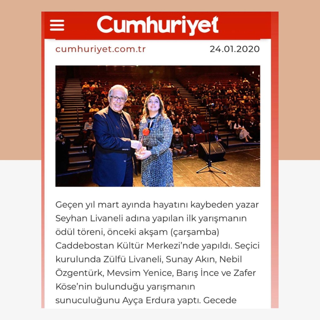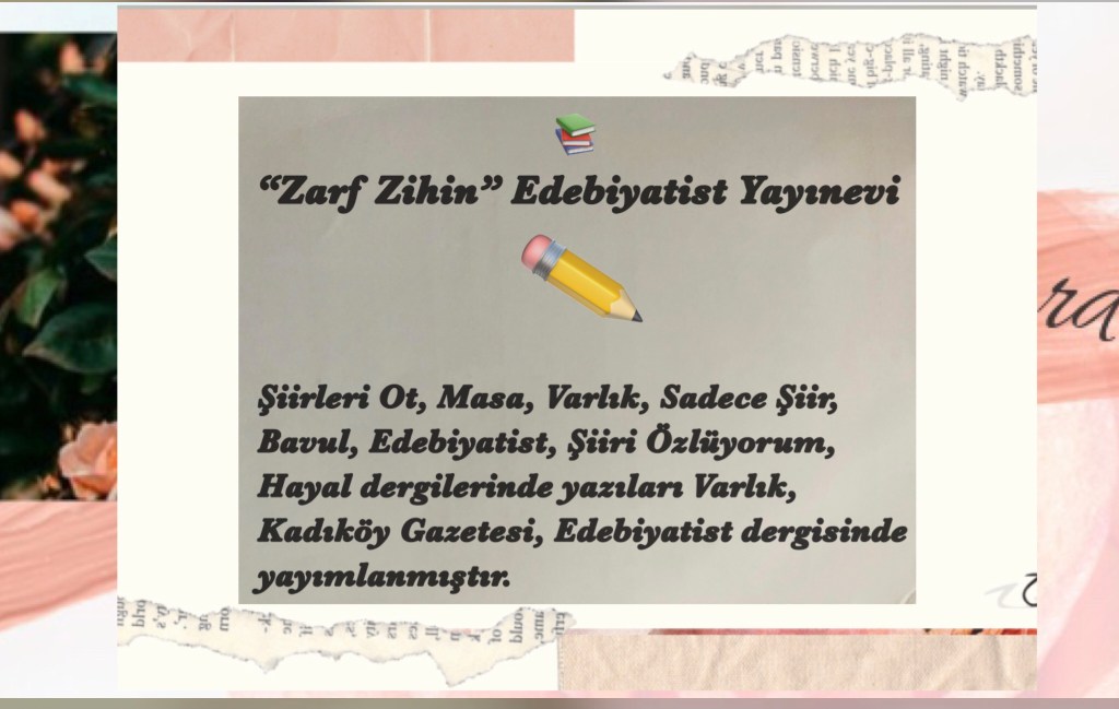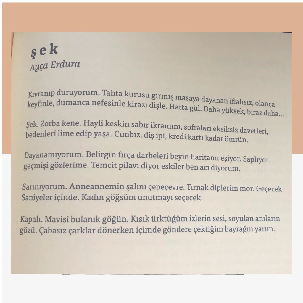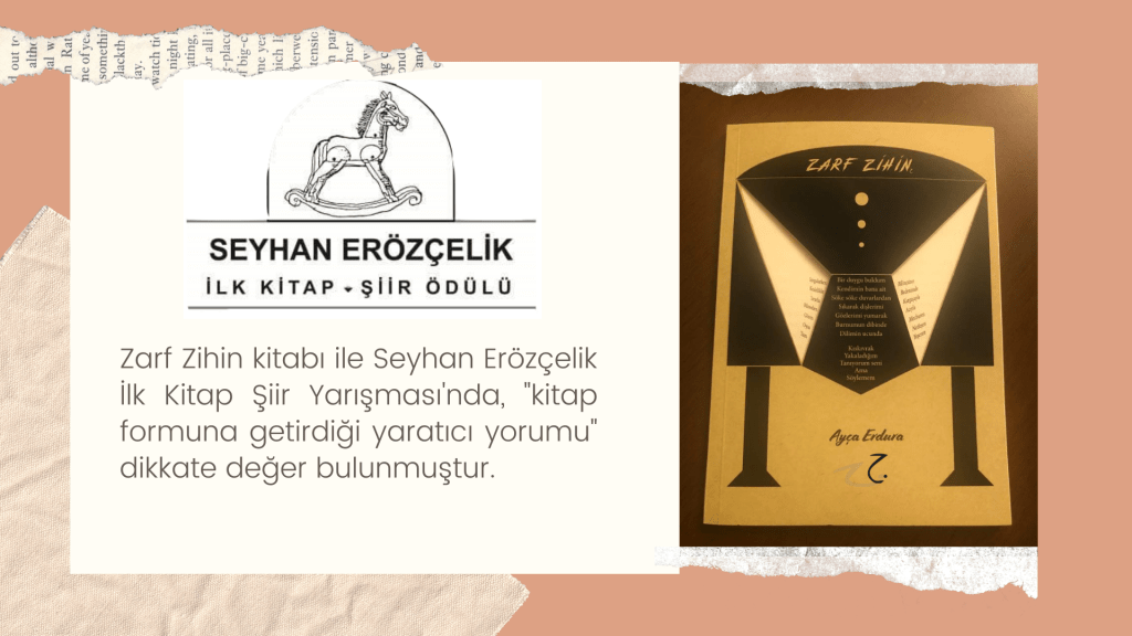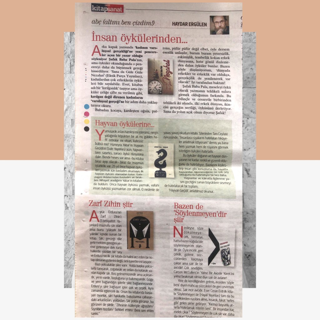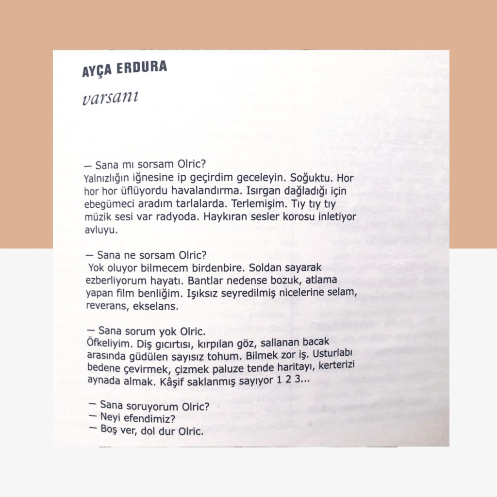 Hikayelerim / Yazılar / Haberler / Derlediğim Kitaplar / Antolojiler 23 Ekim 201922 Mayıs 2021 Ayça Erdura Önce Aşkın Müziği Gelir Edebiyatist Dergi Kasım-Aralık sayısında yayınlanan hikayem (2019) Varlık Dergisi Mart 2021 Yazılar Edebiyatist Dergisi Kasım Aralık 2020 Şair Engin Turgut’un Zarf Zihin kitabımla ilgili yazısı Masa Dergisi Eylül 2020 Seyhan Livaneli Öykü Yarışması söyleşi Ocak 2019 Haydar Ergülen Hocam ile Şiirin Seyri bilgilendirme yazısı Haberler Kadıköy Gazetesi Kasım 2018 Şiirin Seyri söyleşisi Birgün Gazetesi Eylül 2020 Pazar Eki Haydar Ergülen Hocam ile Longplay şiirim Hürriyet Gazetesi Kitap Sanat Eki Zarf Zihin kitabımın değerlendirme yazısı Haydar Ergülen Cumhuriyet Gazetesi Ocak 2020 Seyhan Livaneli Öykü Yarışması 2020 Ödül Töreni Aydınlık Gazetesi Ocak 2020 Kadıköy Gazetesi Kasım 2020 Feministanbul Uluslararası Kadın Şiiri Festivali bilgilendirme yazısı Söyleşiler Son Gemi Dergisi Söyleşi Edebiyat Daima Dergisi Derlemesini Üstlendiğim Kitaplar Mühürlü Şiirler Ekşi Karga Yayınevi Mühür Sanatçısı yudumis Şşşt The Poet House Yayınevi Antolojiler Feministanbul Uluslararası Kadın Şiiri Festivali Antolojisi Benidorm İstanbul 2020 Türk Şairler Seçkisi Türkçe İngilizce Ve İspanyolca yayımlanmıştır.