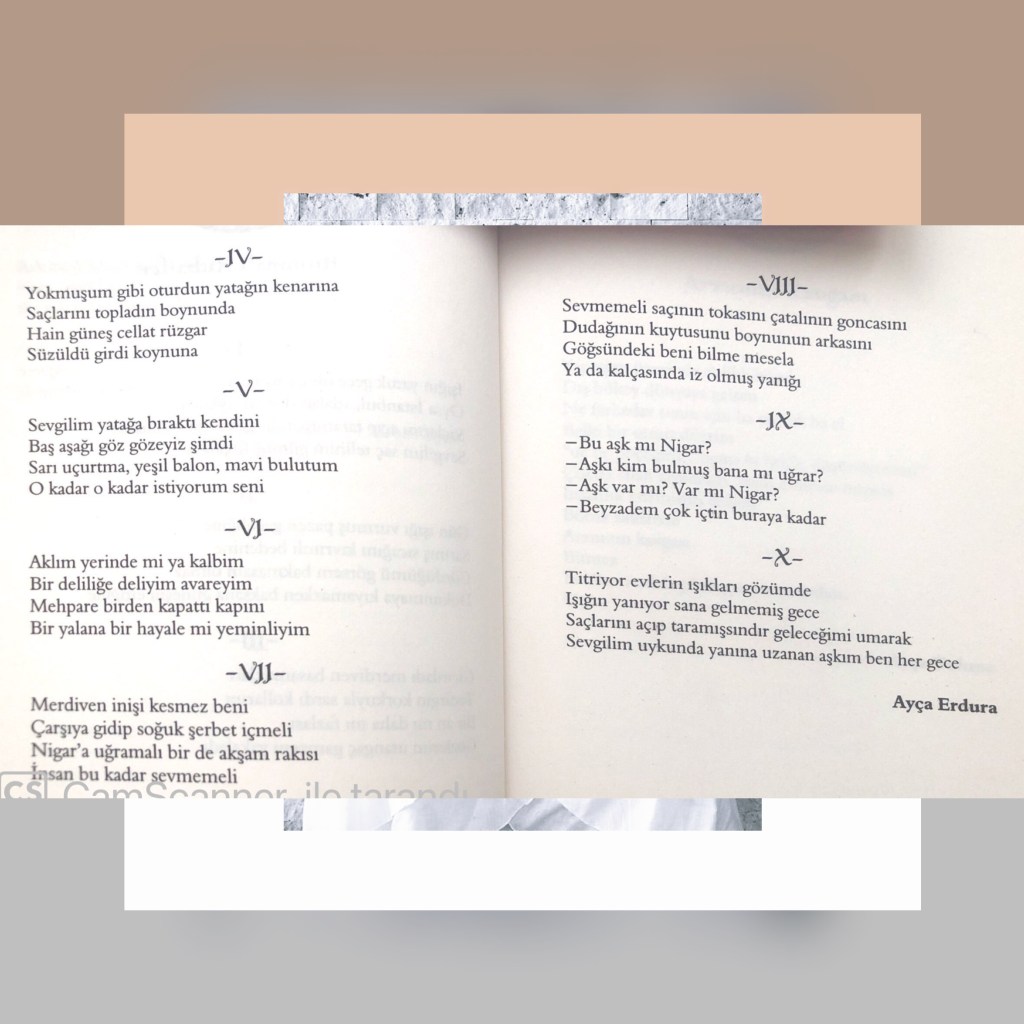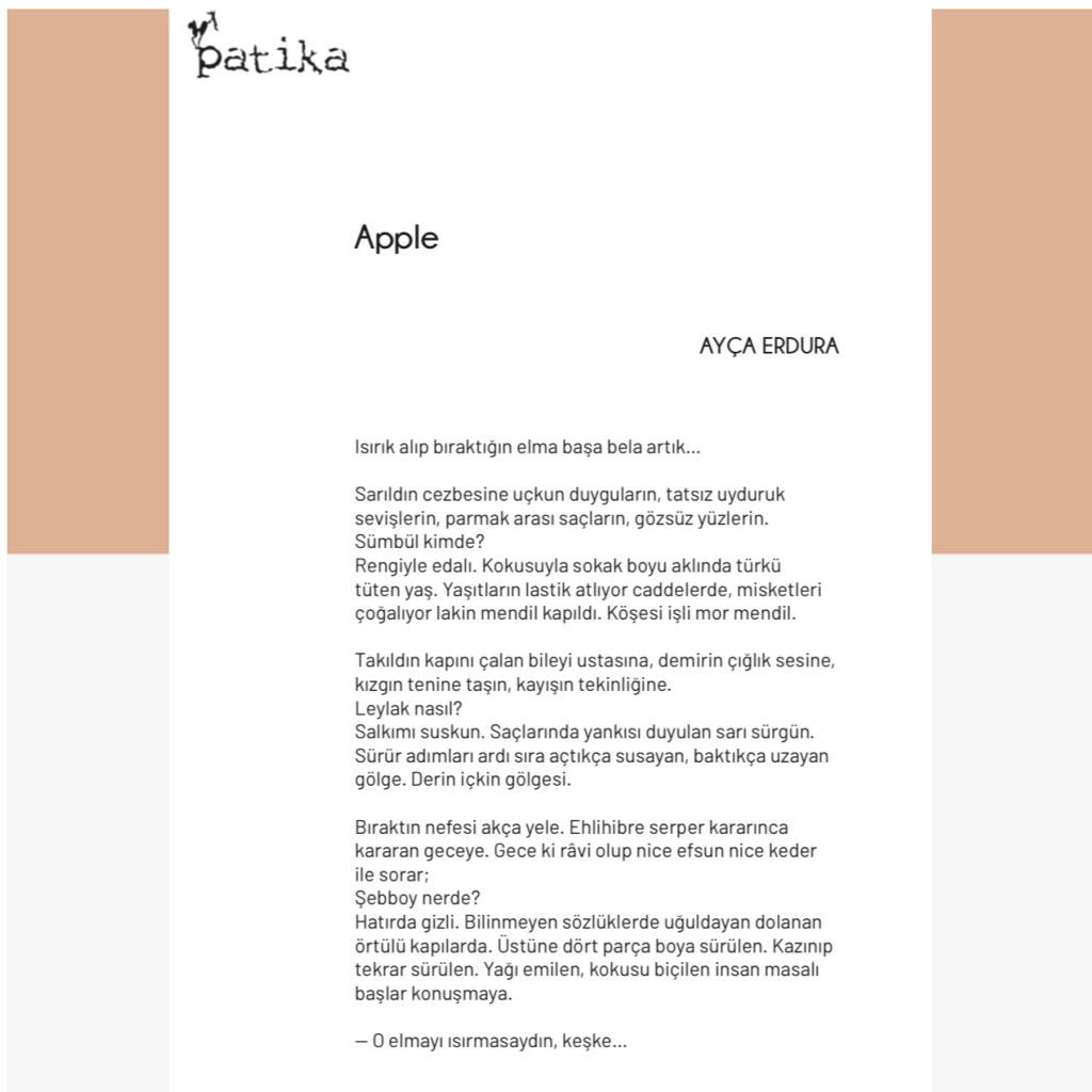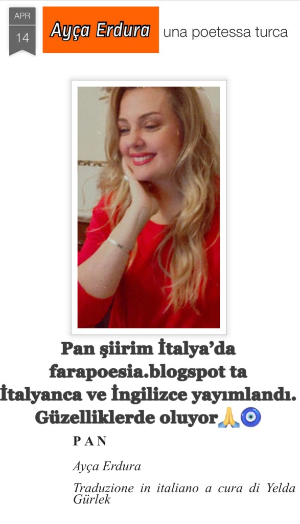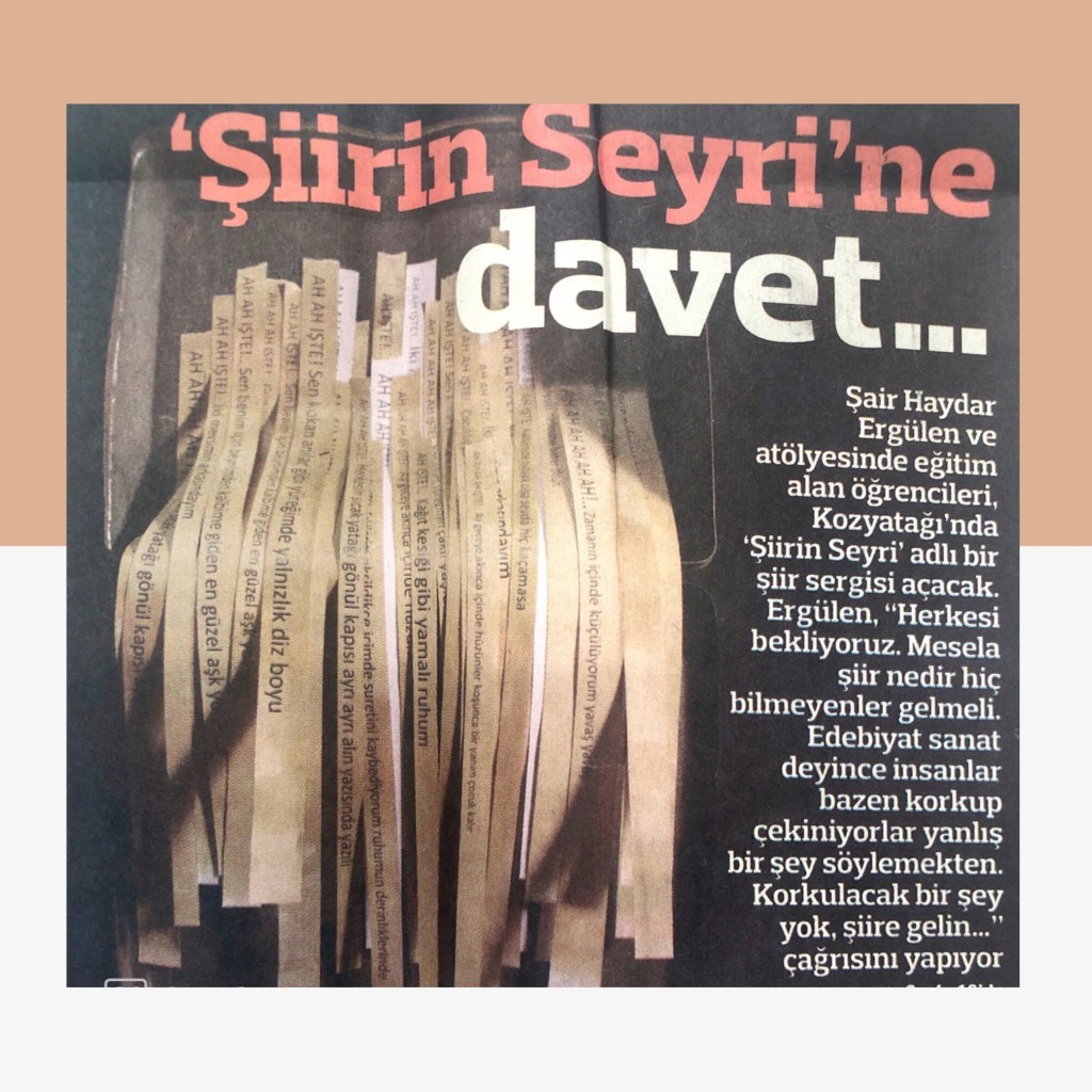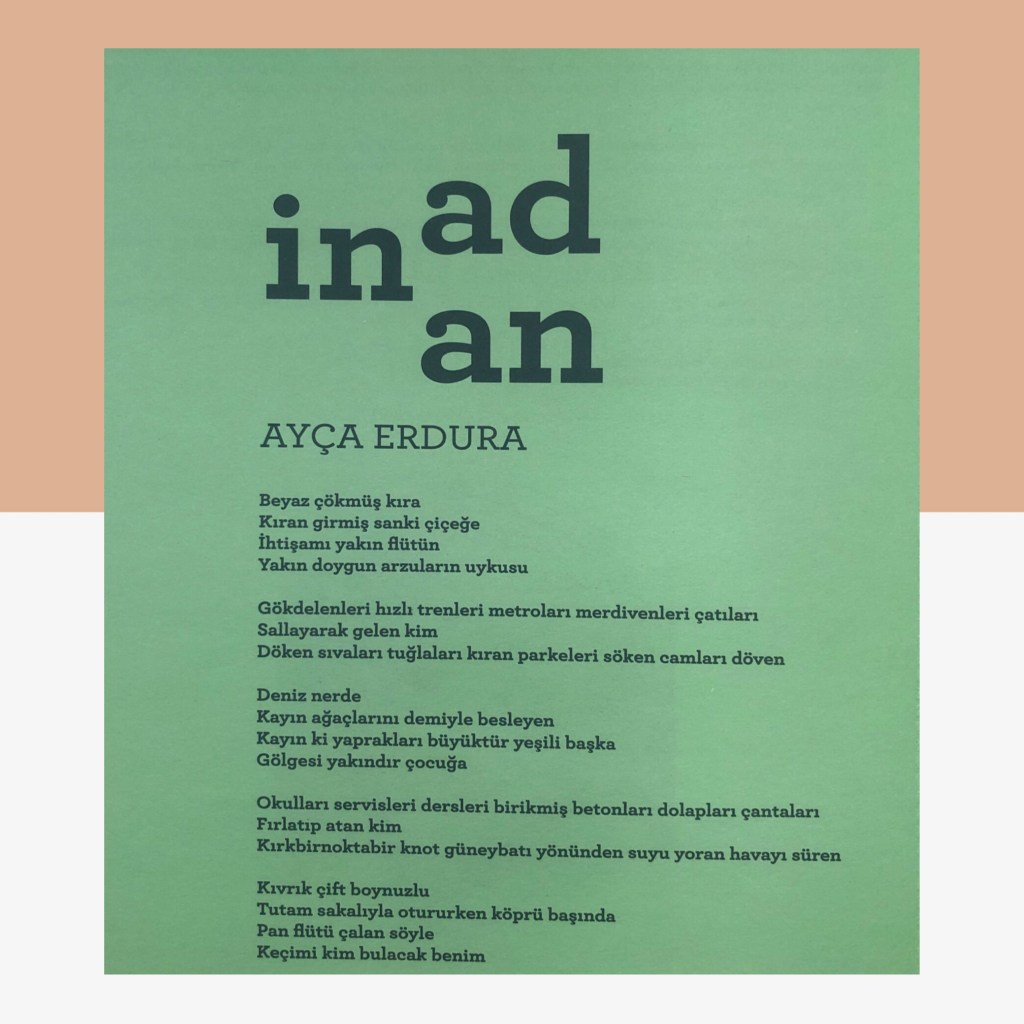 Hikayelerim / Yazılar / Haberler / Derlediğim Kitaplar / Antolojiler 23 Ekim 201922 Mayıs 2021 Ayça Erdura Önce Aşkın Müziği Gelir Edebiyatist Dergi Kasım-Aralık sayısında yayınlanan hikayem (2019) Varlık Dergisi Mart 2021 Yazılar Edebiyatist Dergisi Kasım Aralık 2020 Şair Engin Turgut’un Zarf Zihin kitabımla ilgili yazısı Masa Dergisi Eylül 2020 Seyhan Livaneli Öykü Yarışması söyleşi Ocak 2019 Haydar Ergülen Hocam ile Şiirin Seyri bilgilendirme yazısı Haberler Kadıköy Gazetesi Kasım 2018 Şiirin Seyri söyleşisi Birgün Gazetesi Eylül 2020 Pazar Eki Haydar Ergülen Hocam ile Longplay şiirim Hürriyet Gazetesi Kitap Sanat Eki Zarf Zihin kitabımın değerlendirme yazısı Haydar Ergülen Cumhuriyet Gazetesi Ocak 2020 Seyhan Livaneli Öykü Yarışması 2020 Ödül Töreni Aydınlık Gazetesi Ocak 2020 Kadıköy Gazetesi Kasım 2020 Feministanbul Uluslararası Kadın Şiiri Festivali bilgilendirme yazısı Söyleşiler Son Gemi Dergisi Söyleşi Edebiyat Daima Dergisi Derlemesini Üstlendiğim Kitaplar Mühürlü Şiirler Ekşi Karga Yayınevi Mühür Sanatçısı yudumis Şşşt The Poet House Yayınevi Antolojiler Feministanbul Uluslararası Kadın Şiiri Festivali Antolojisi Benidorm İstanbul 2020 Türk Şairler Seçkisi Türkçe İngilizce Ve İspanyolca yayımlanmıştır.