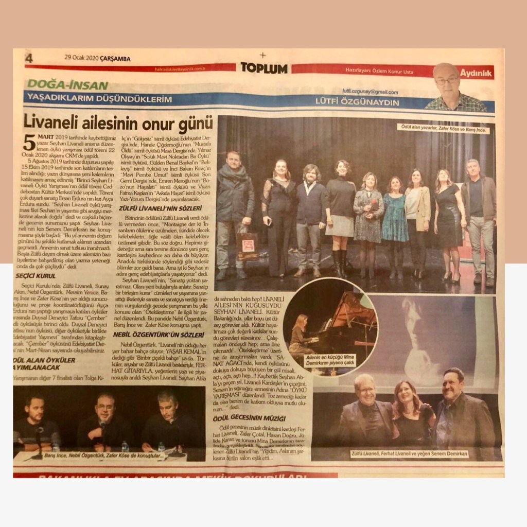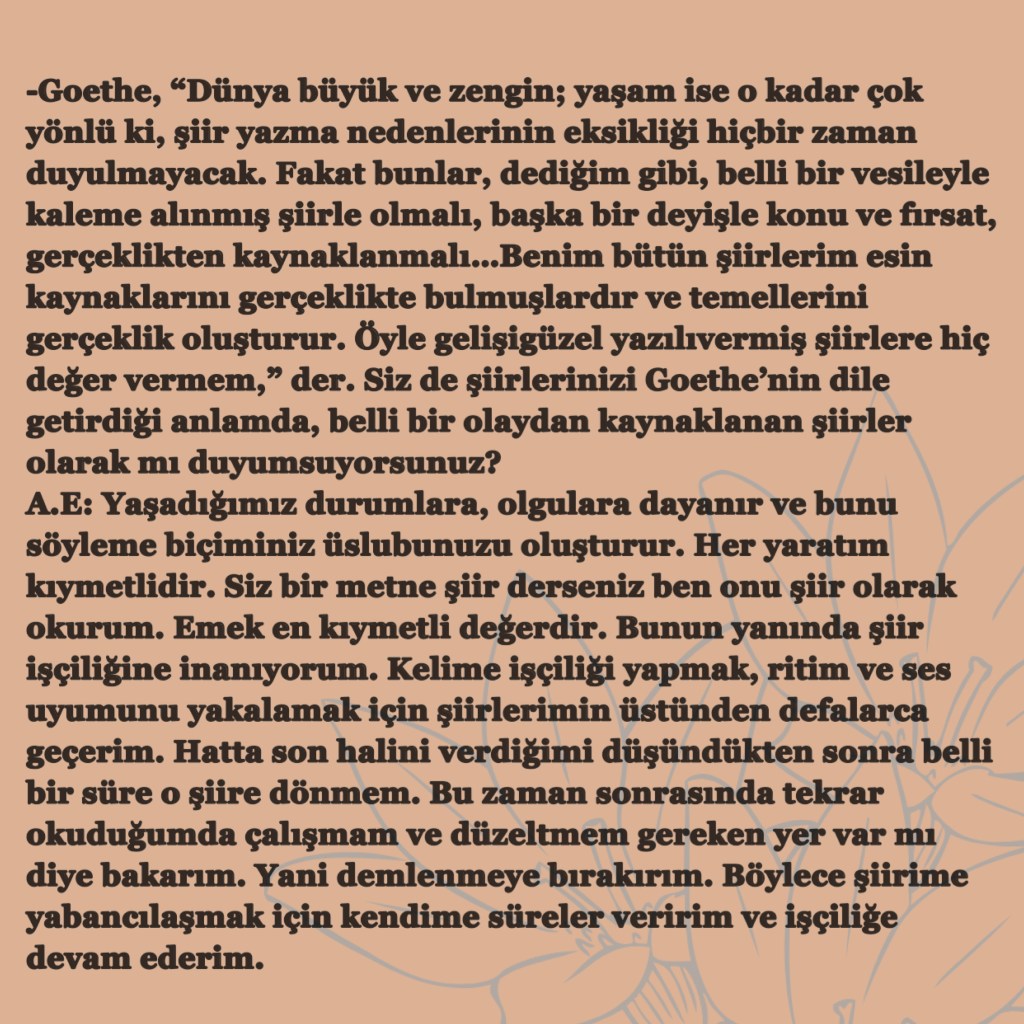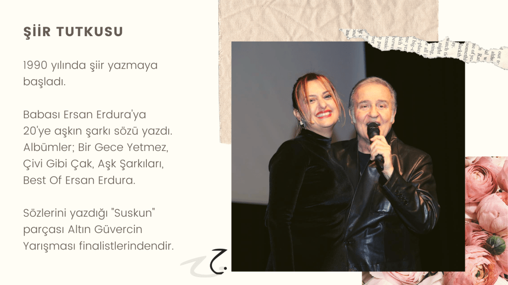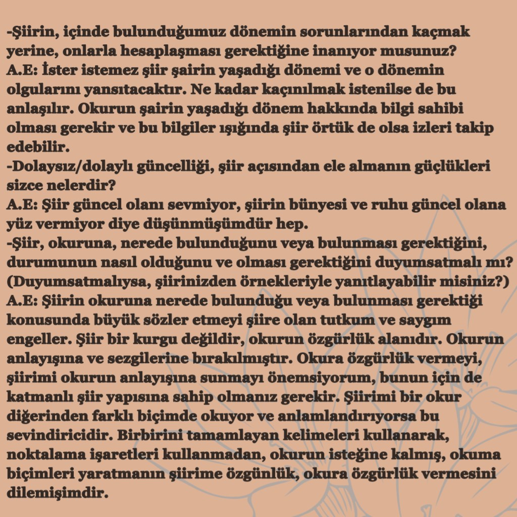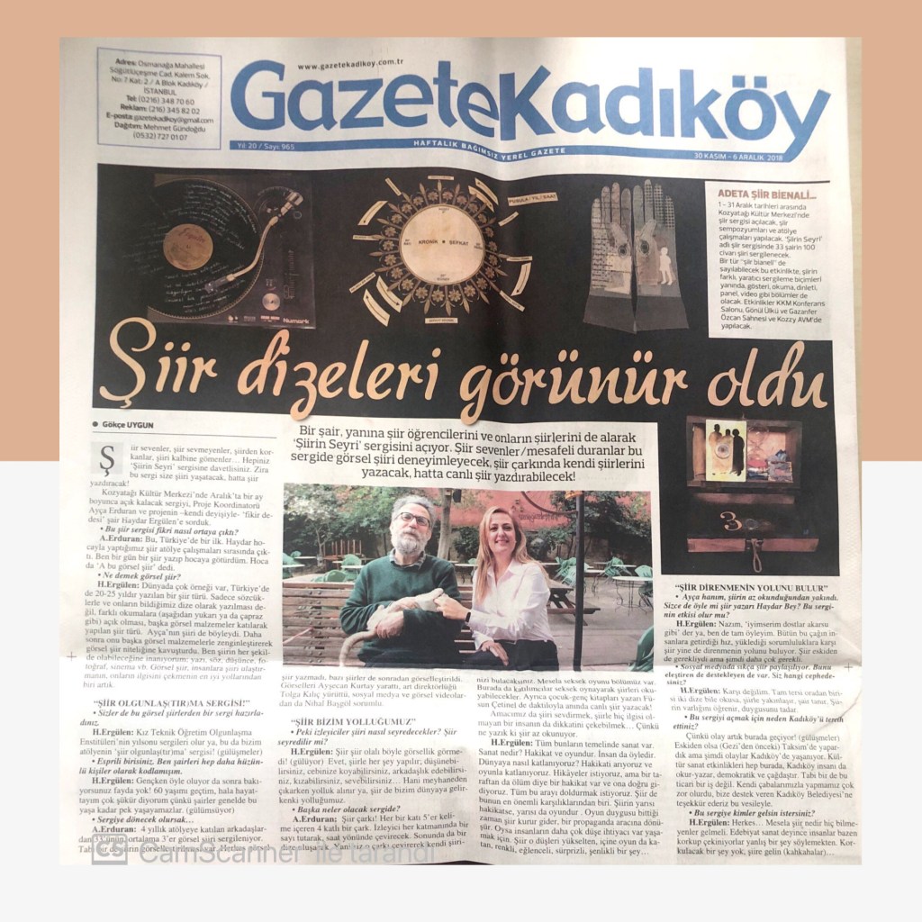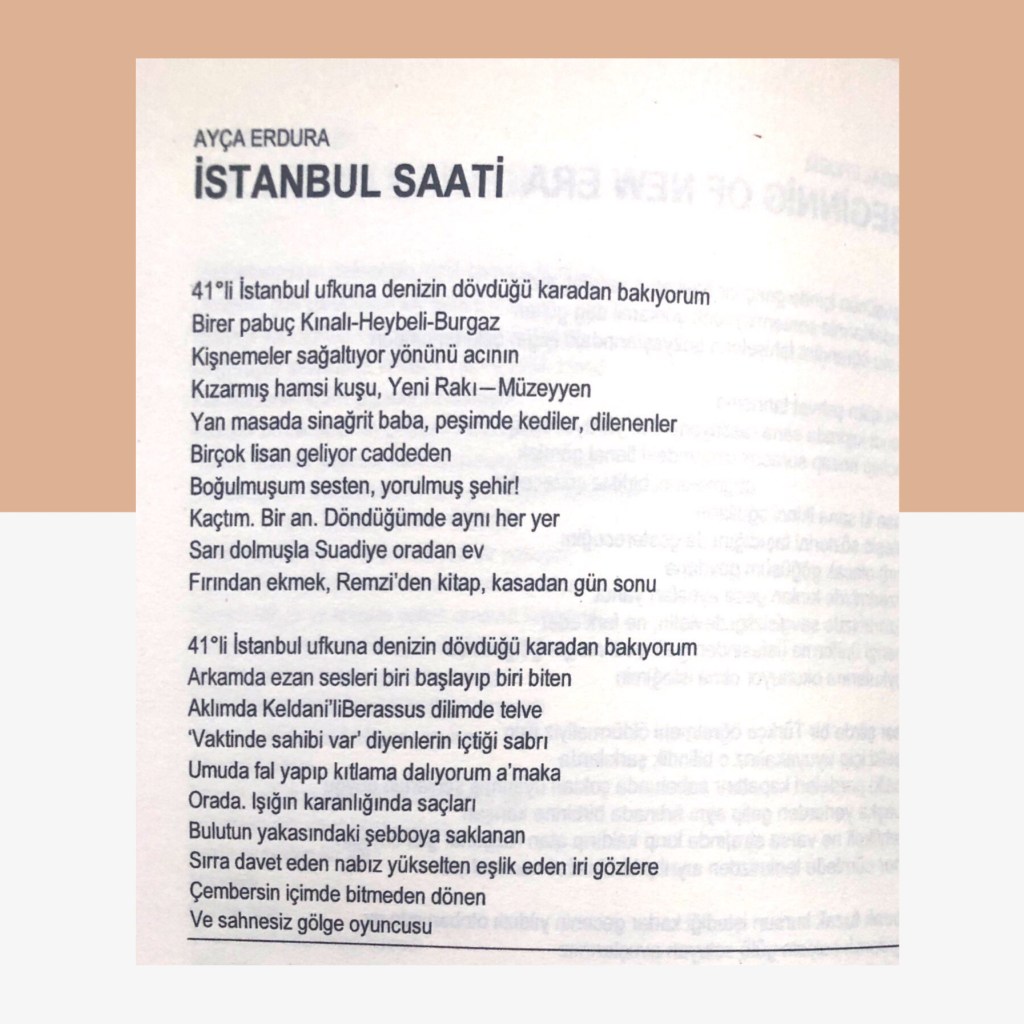Hikayelerim / Yazılar / Haberler / Derlediğim Kitaplar / Antolojiler 23 Ekim 201922 Mayıs 2021 Ayça Erdura Önce Aşkın Müziği Gelir Edebiyatist Dergi Kasım-Aralık sayısında yayınlanan hikayem (2019) Varlık Dergisi Mart 2021 Yazılar Edebiyatist Dergisi Kasım Aralık 2020 Şair Engin Turgut’un Zarf Zihin kitabımla ilgili yazısı Masa Dergisi Eylül 2020 Seyhan Livaneli Öykü Yarışması söyleşi Ocak 2019 Haydar Ergülen Hocam ile Şiirin Seyri bilgilendirme yazısı Haberler Kadıköy Gazetesi Kasım 2018 Şiirin Seyri söyleşisi Birgün Gazetesi Eylül 2020 Pazar Eki Haydar Ergülen Hocam ile Longplay şiirim Hürriyet Gazetesi Kitap Sanat Eki Zarf Zihin kitabımın değerlendirme yazısı Haydar Ergülen Cumhuriyet Gazetesi Ocak 2020 Seyhan Livaneli Öykü Yarışması 2020 Ödül Töreni Aydınlık Gazetesi Ocak 2020 Kadıköy Gazetesi Kasım 2020 Feministanbul Uluslararası Kadın Şiiri Festivali bilgilendirme yazısı Söyleşiler Son Gemi Dergisi Söyleşi Edebiyat Daima Dergisi Derlemesini Üstlendiğim Kitaplar Mühürlü Şiirler Ekşi Karga Yayınevi Mühür Sanatçısı yudumis Şşşt The Poet House Yayınevi Antolojiler Feministanbul Uluslararası Kadın Şiiri Festivali Antolojisi Benidorm İstanbul 2020 Türk Şairler Seçkisi Türkçe İngilizce Ve İspanyolca yayımlanmıştır.