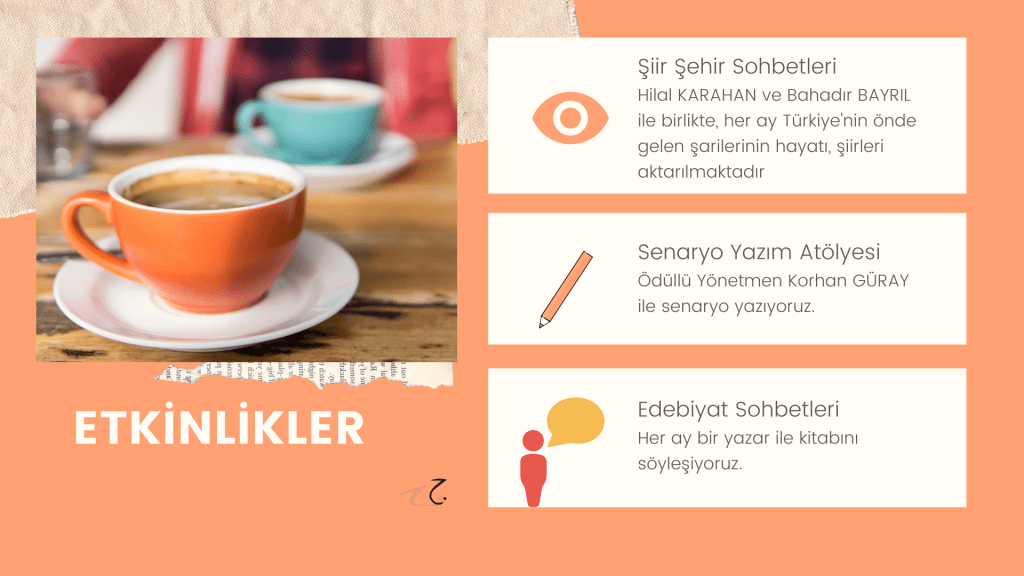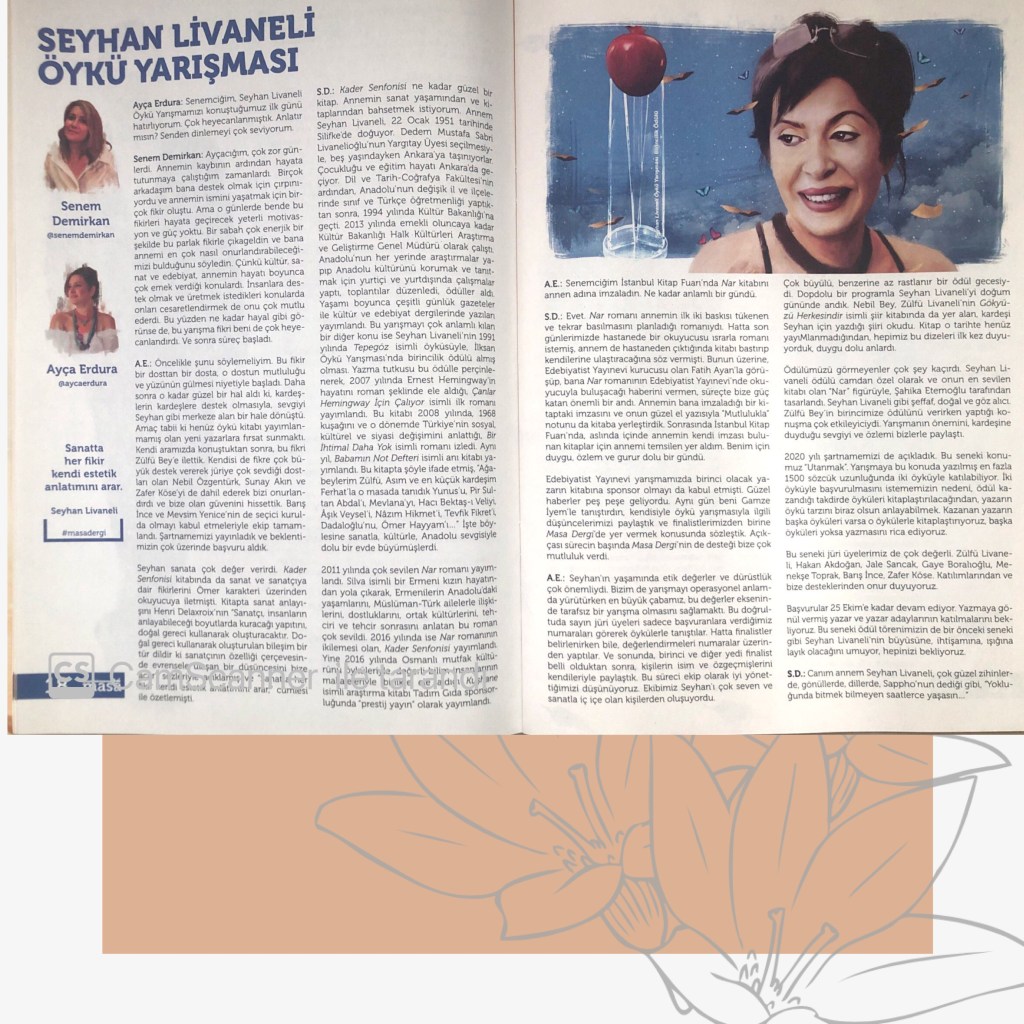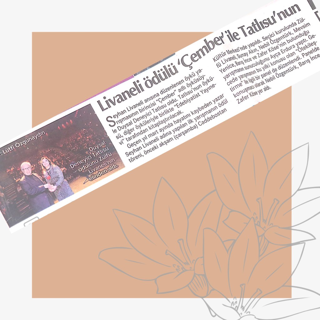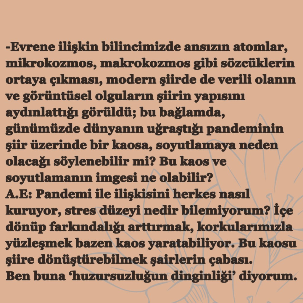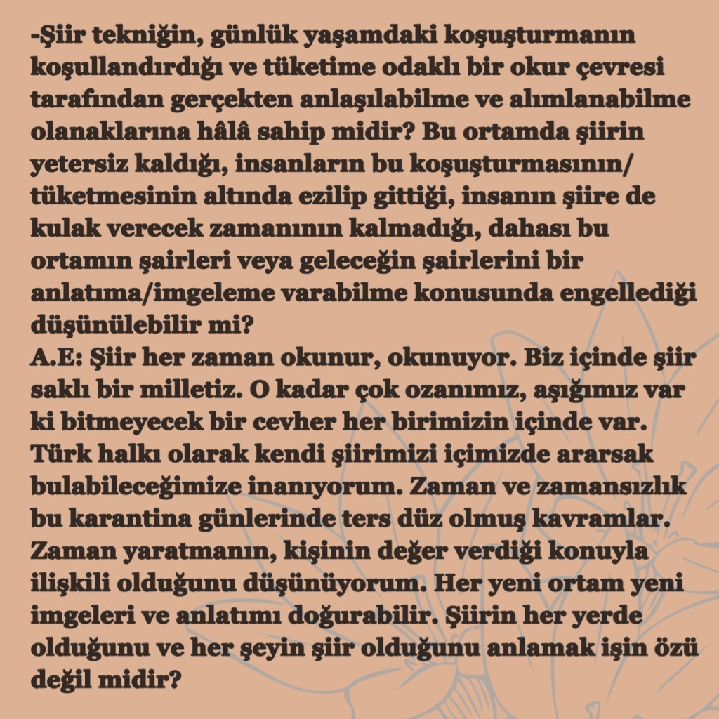 Hikayelerim / Yazılar / Haberler / Derlediğim Kitaplar / Antolojiler 23 Ekim 201922 Mayıs 2021 Ayça Erdura Önce Aşkın Müziği Gelir Edebiyatist Dergi Kasım-Aralık sayısında yayınlanan hikayem (2019) Varlık Dergisi Mart 2021 Yazılar Edebiyatist Dergisi Kasım Aralık 2020 Şair Engin Turgut’un Zarf Zihin kitabımla ilgili yazısı Masa Dergisi Eylül 2020 Seyhan Livaneli Öykü Yarışması söyleşi Ocak 2019 Haydar Ergülen Hocam ile Şiirin Seyri bilgilendirme yazısı Haberler Kadıköy Gazetesi Kasım 2018 Şiirin Seyri söyleşisi Birgün Gazetesi Eylül 2020 Pazar Eki Haydar Ergülen Hocam ile Longplay şiirim Hürriyet Gazetesi Kitap Sanat Eki Zarf Zihin kitabımın değerlendirme yazısı Haydar Ergülen Cumhuriyet Gazetesi Ocak 2020 Seyhan Livaneli Öykü Yarışması 2020 Ödül Töreni Aydınlık Gazetesi Ocak 2020 Kadıköy Gazetesi Kasım 2020 Feministanbul Uluslararası Kadın Şiiri Festivali bilgilendirme yazısı Söyleşiler Son Gemi Dergisi Söyleşi Edebiyat Daima Dergisi Derlemesini Üstlendiğim Kitaplar Mühürlü Şiirler Ekşi Karga Yayınevi Mühür Sanatçısı yudumis Şşşt The Poet House Yayınevi Antolojiler Feministanbul Uluslararası Kadın Şiiri Festivali Antolojisi Benidorm İstanbul 2020 Türk Şairler Seçkisi Türkçe İngilizce Ve İspanyolca yayımlanmıştır.