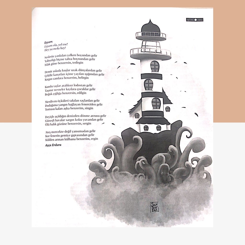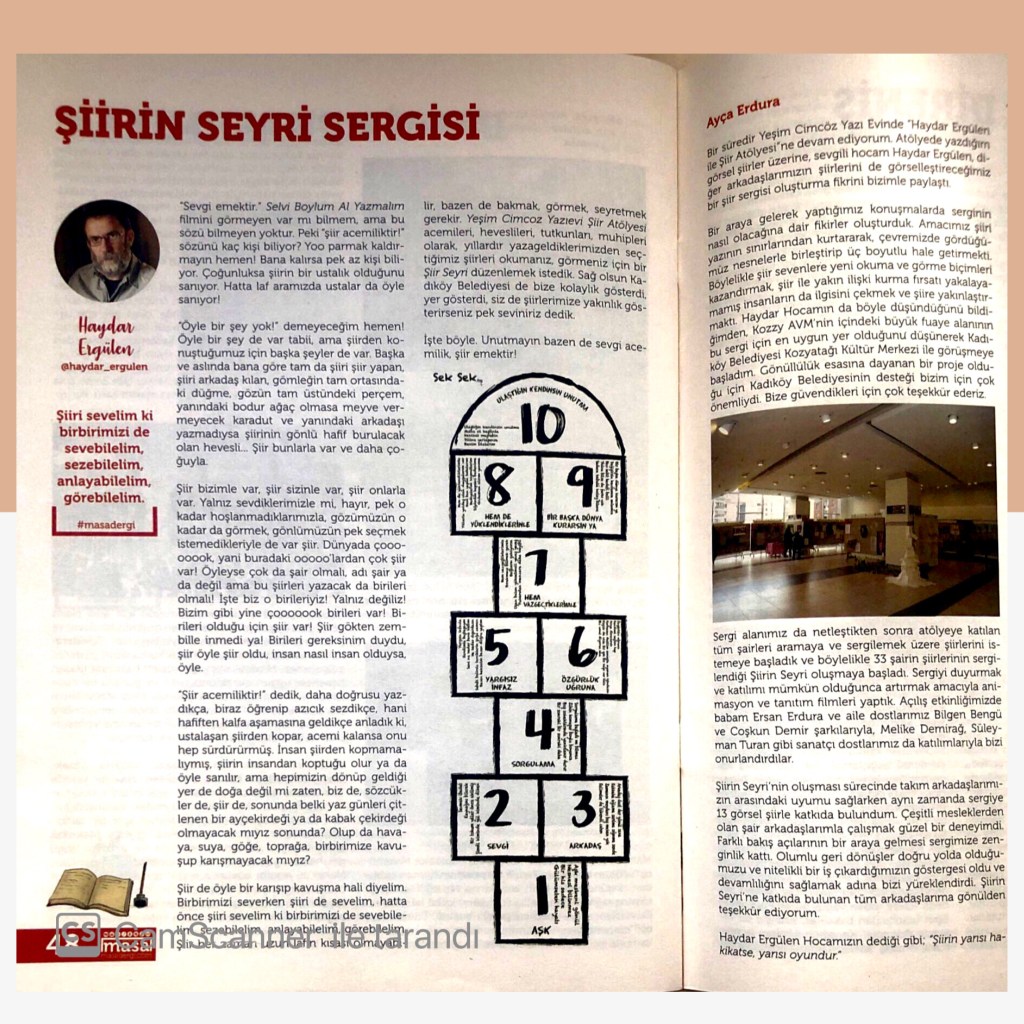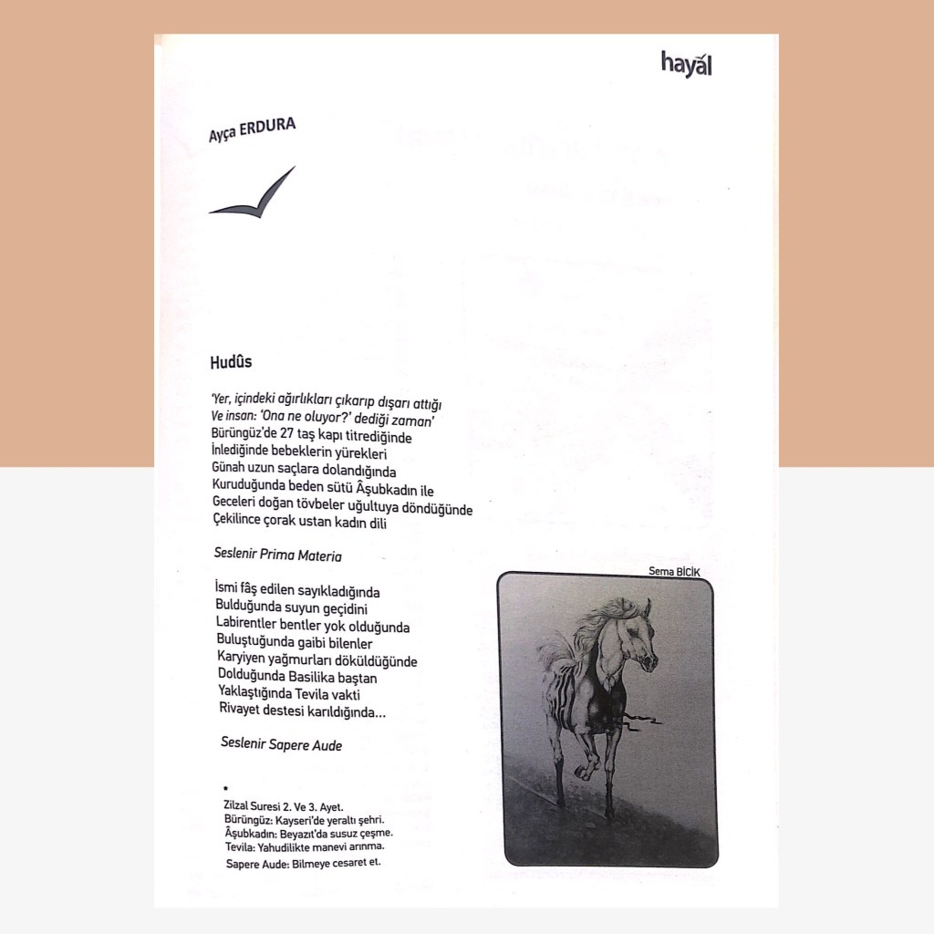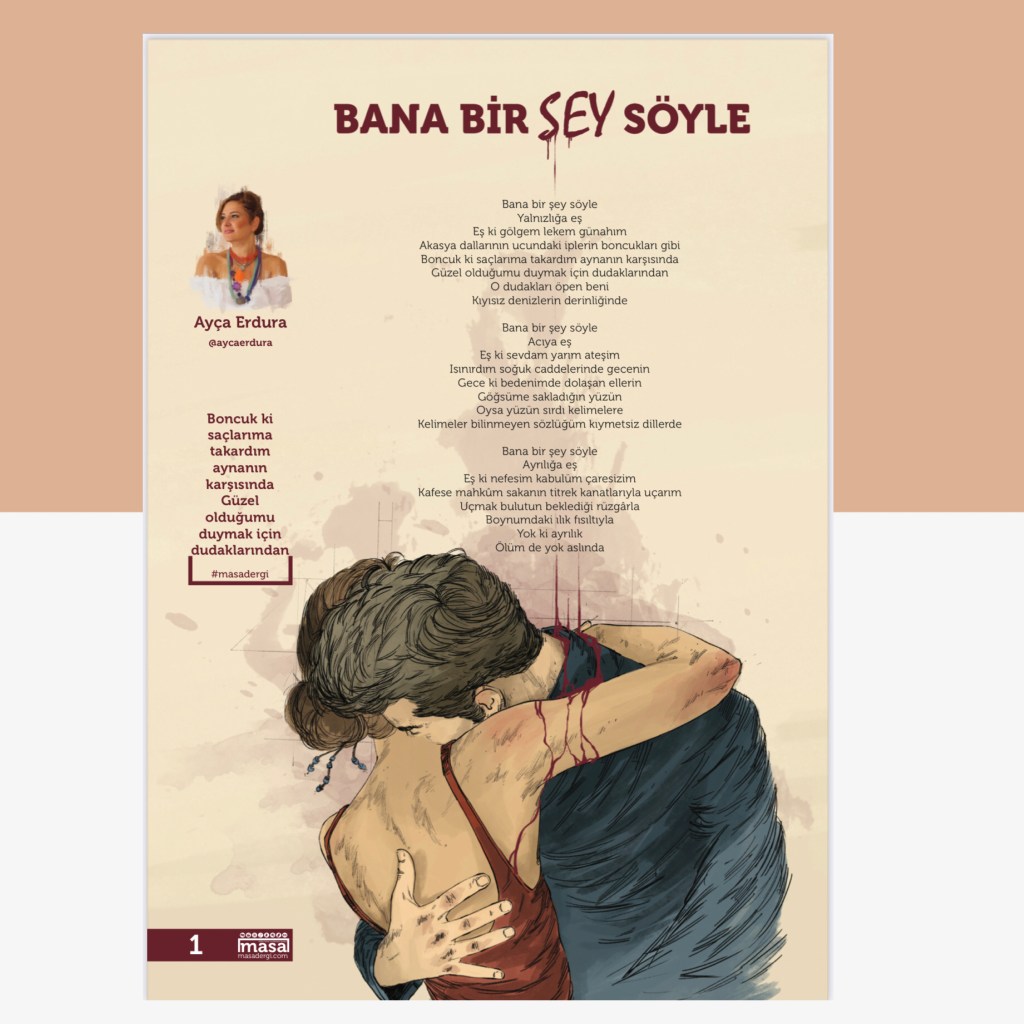 Şiirlerim 10 Mart 202122 Mayıs 2021 Ayça Erdura Görsel Şiirlerim Dergilerde Yayımlanan Şiirlerim Varlık Dergisi Ağustos 2020 Şeref Bilsel’in Yorumu Masa Dergisi Mart 2020 Mayıs 2020 Haziran 2020 Kasım 2020 Edebiyatist Dergisi Mart Nisan 2020 Kalbin Segahı okuma seçenekleri Mart Nisan 2021 Bavul Dergisi Kasım 2020 Sadece Şiir Dergisi Haziran Ağustos 2020 Hayal Dergisi Ocak-Şubat-Mart 2021 Edebiyat Atölye Dergisi Aralık Ocak Şubat 2021 Veronika Dergisi Mayıs Haziran 2020 Temmuz Ağustos 2020 Papirüs Dergisi Temmuz Ağustos 2020 Eylül Ekim 2020 Kasım Aralık 2020 Patika Dergisi Nisan-Mayıs-Haziran 2021 Natama Dergisi Nisan-Eylül 2021