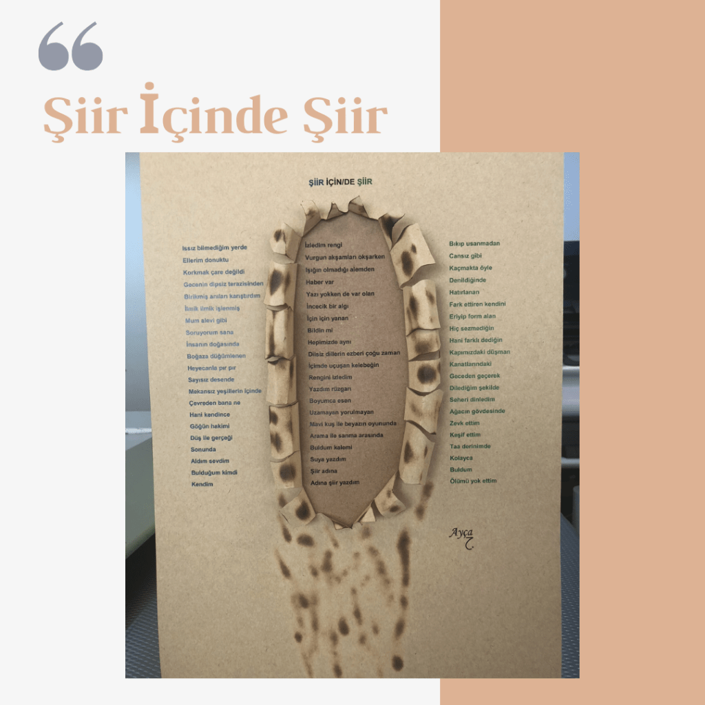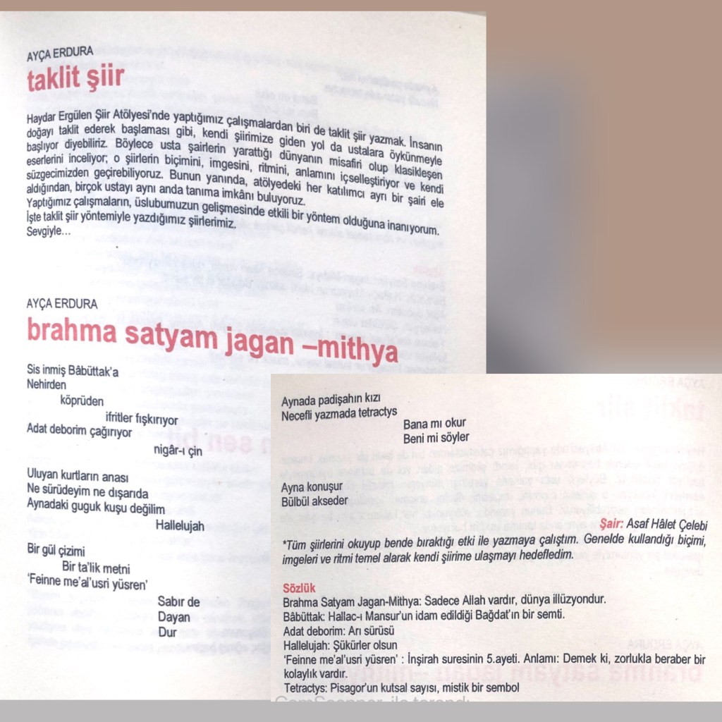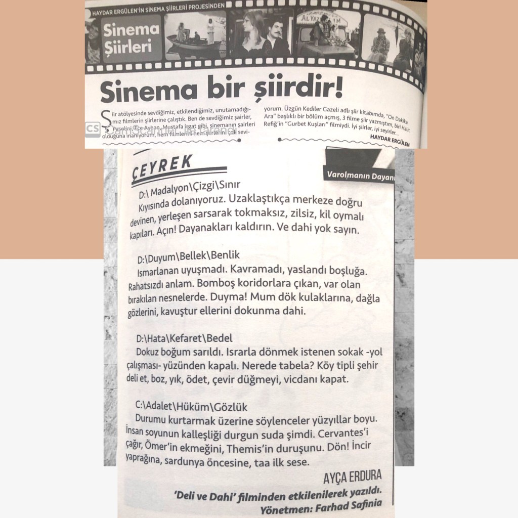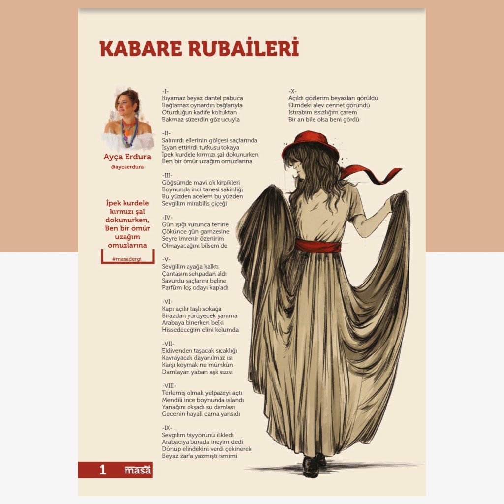 Şiirlerim 10 Mart 202122 Mayıs 2021 Ayça Erdura Görsel Şiirlerim Dergilerde Yayımlanan Şiirlerim Varlık Dergisi Ağustos 2020 Şeref Bilsel’in Yorumu Masa Dergisi Mart 2020 Mayıs 2020 Haziran 2020 Kasım 2020 Edebiyatist Dergisi Mart Nisan 2020 Kalbin Segahı okuma seçenekleri Mart Nisan 2021 Bavul Dergisi Kasım 2020 Sadece Şiir Dergisi Haziran Ağustos 2020 Hayal Dergisi Ocak-Şubat-Mart 2021 Edebiyat Atölye Dergisi Aralık Ocak Şubat 2021 Veronika Dergisi Mayıs Haziran 2020 Temmuz Ağustos 2020 Papirüs Dergisi Temmuz Ağustos 2020 Eylül Ekim 2020 Kasım Aralık 2020 Patika Dergisi Nisan-Mayıs-Haziran 2021 Natama Dergisi Nisan-Eylül 2021